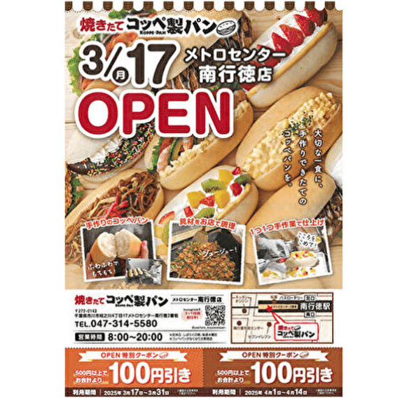 メトロセンター南行徳2番街 焼きたてコッぺ製パンが、3月17日(月)オープンしました。